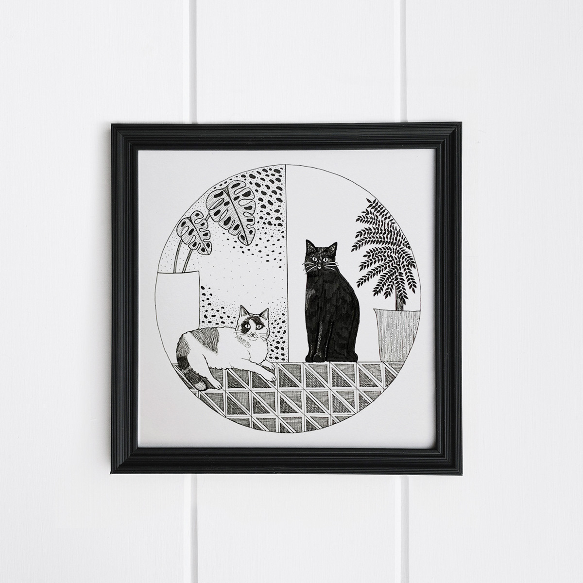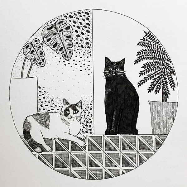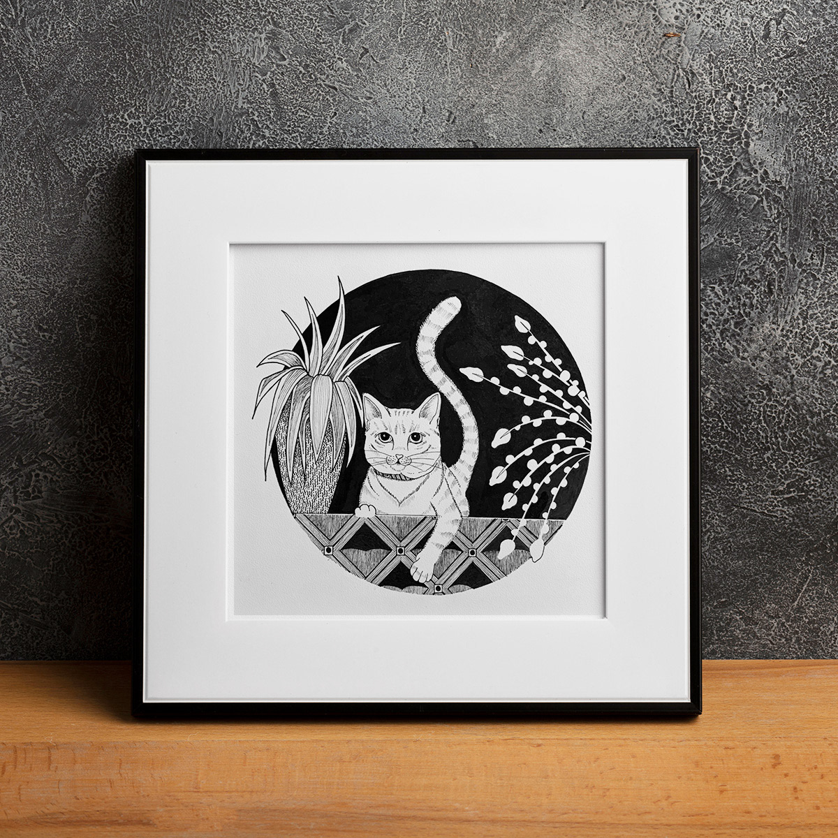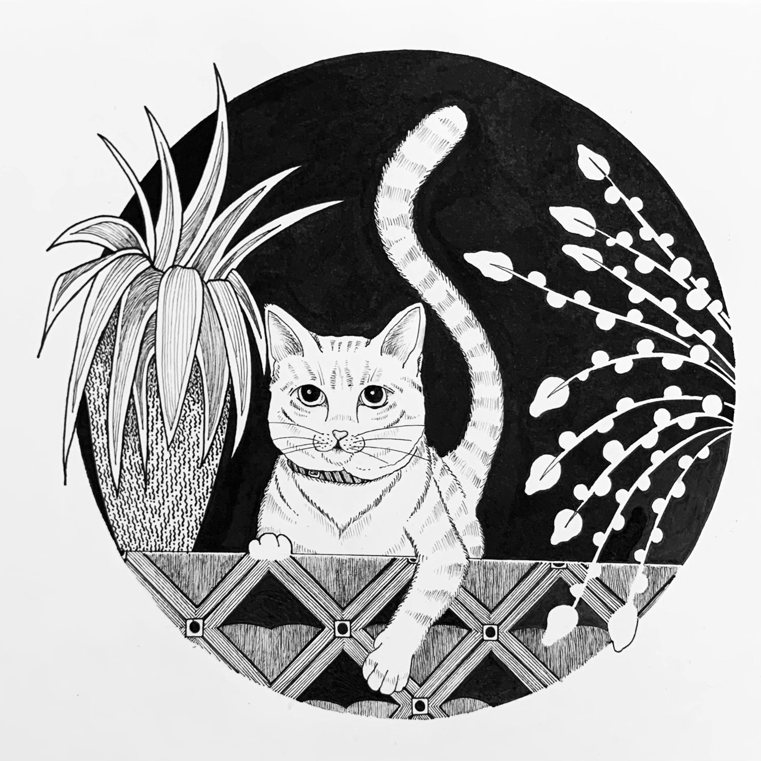 Ilustração do gato em meio a plantas, realizada em nanquim.